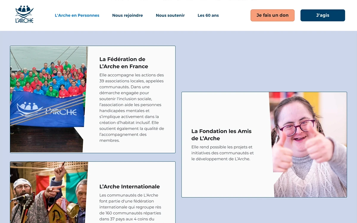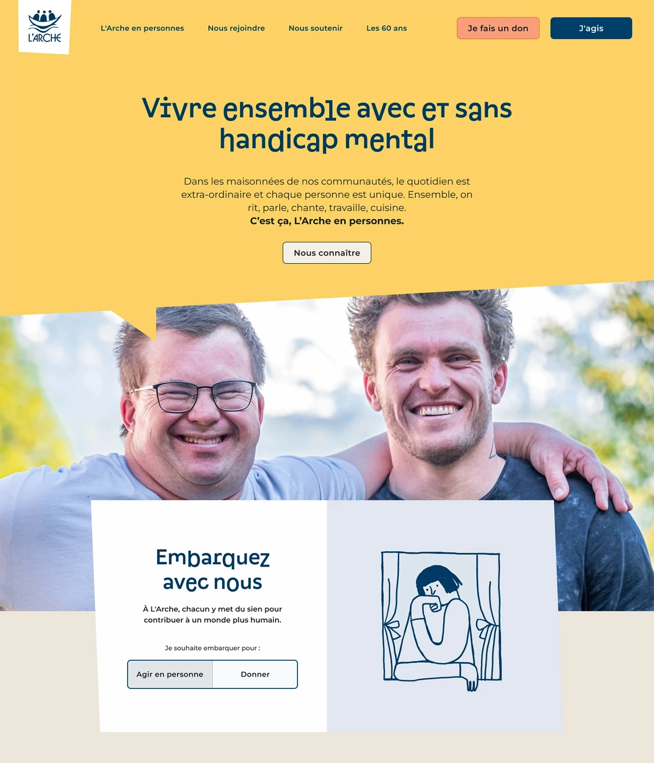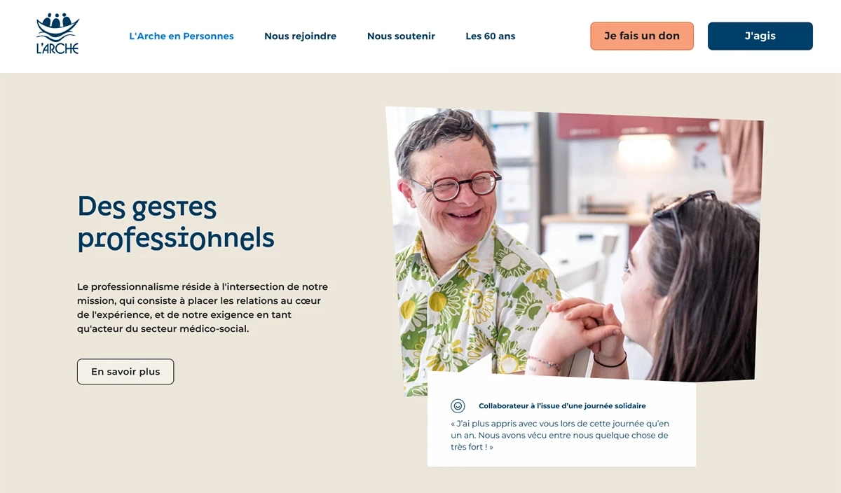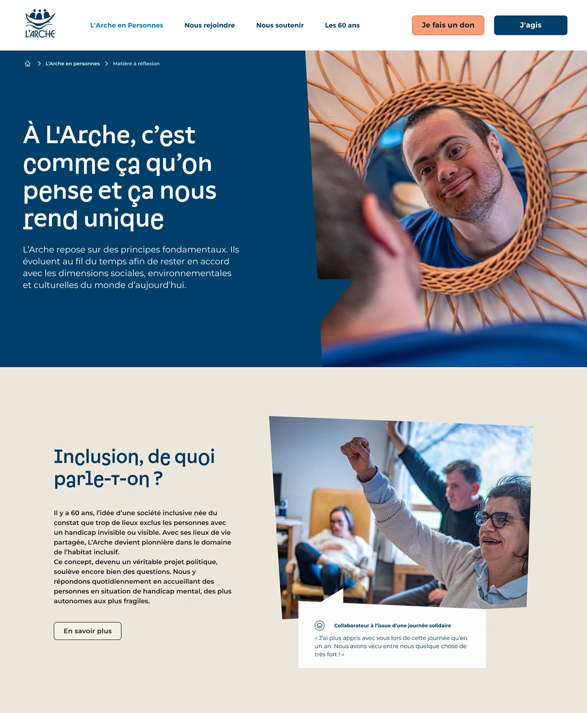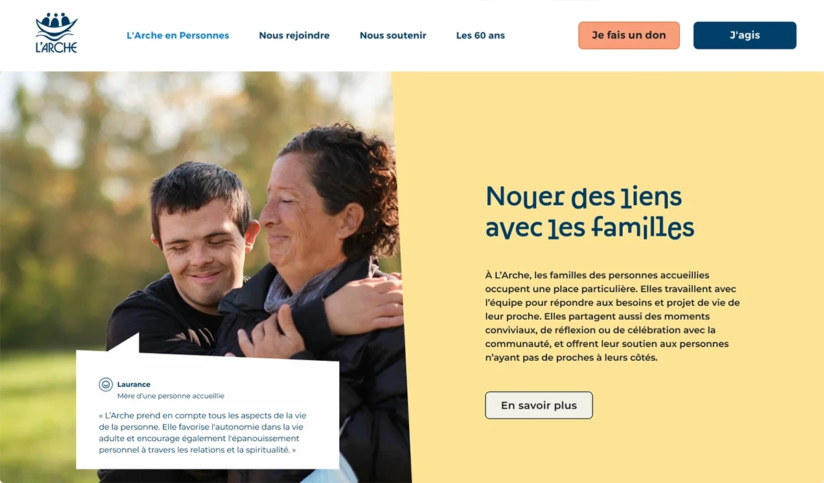 Inspirados en el espíritu de convivencia de L’Arche y en la pluralidad de la nueva identidad visual, creamos una web cuyos protagonistas son las personas. Diseñamos entonces espacios de diálogo, en donde la fotografía, el copy y los testimoniales crean pequeñas historias, así la voz de los beneficiados y proyectando el impacto positivo de quienes quieran aportar al proyecto.