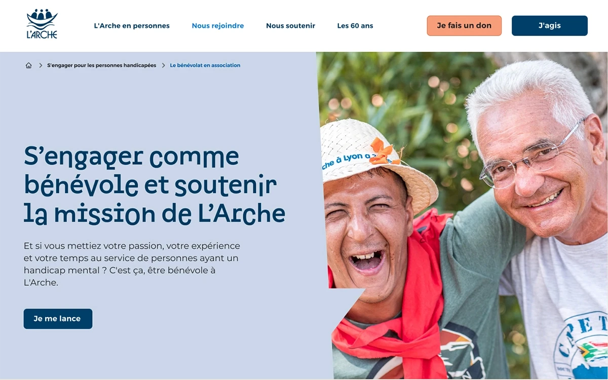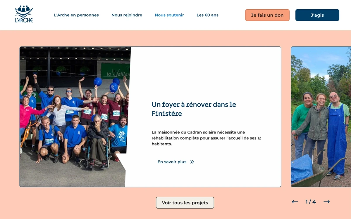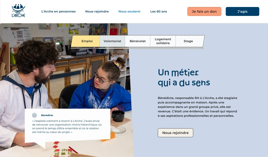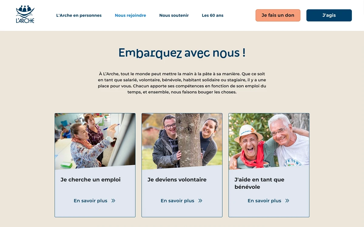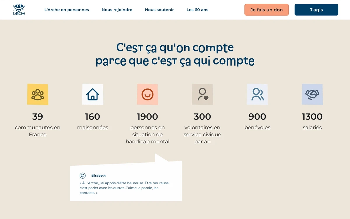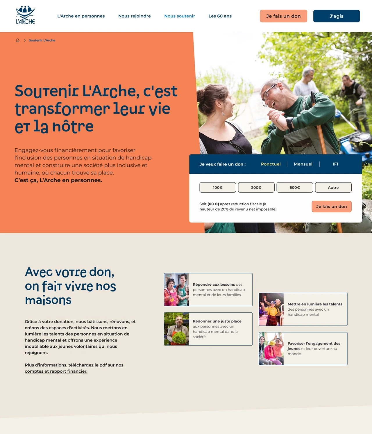 Inspirados en el espíritu de convivencia de L’Arche y en la pluralidad de la nueva identidad visual, creamos una web cuyos protagonistas son las personas. Diseñamos entonces espacios de diálogo, en donde la fotografía, el copy y los testimoniales crean pequeñas historias, así la voz de los beneficiados y proyectando el impacto positivo de quienes quieran aportar al proyecto.