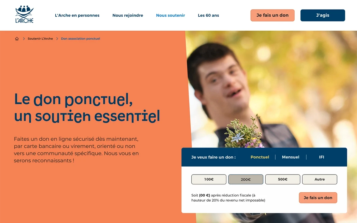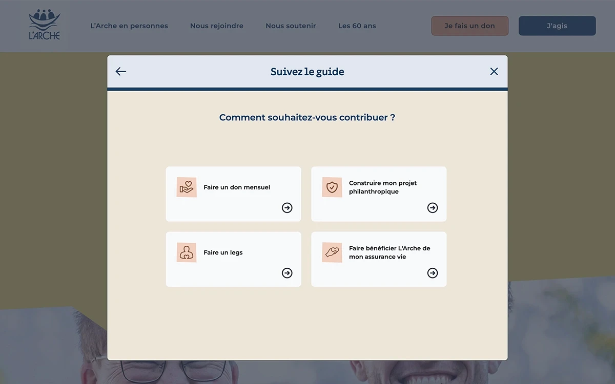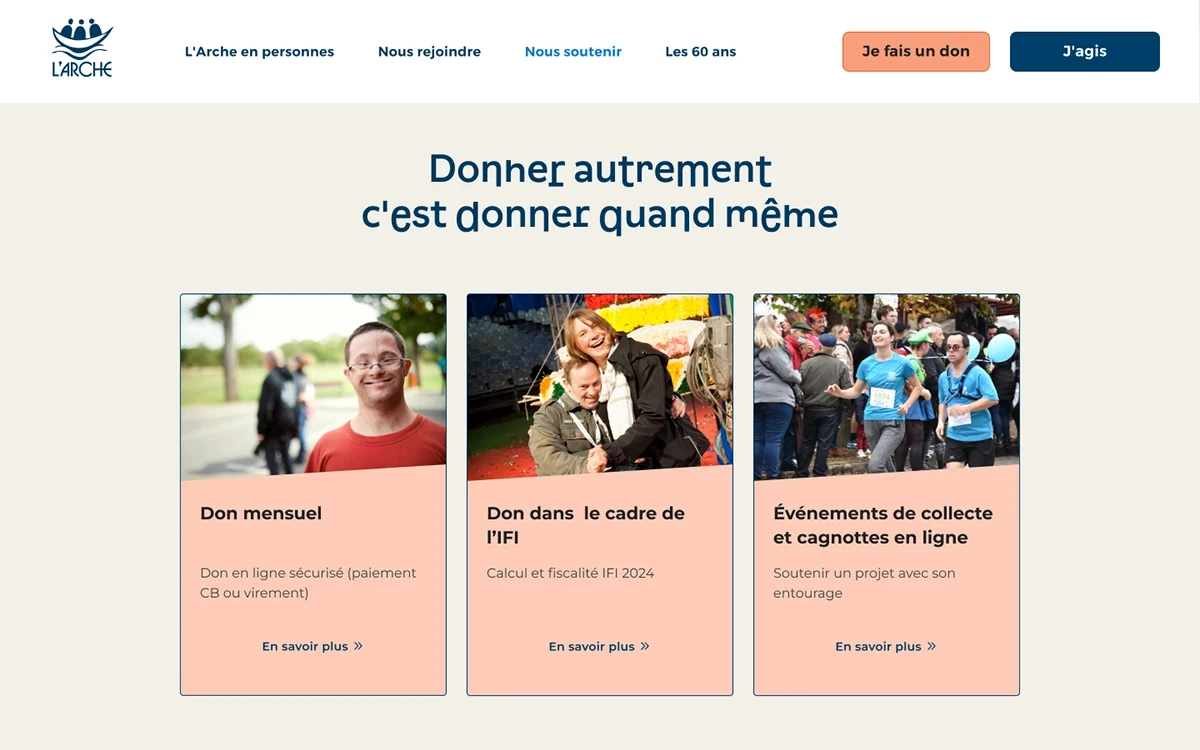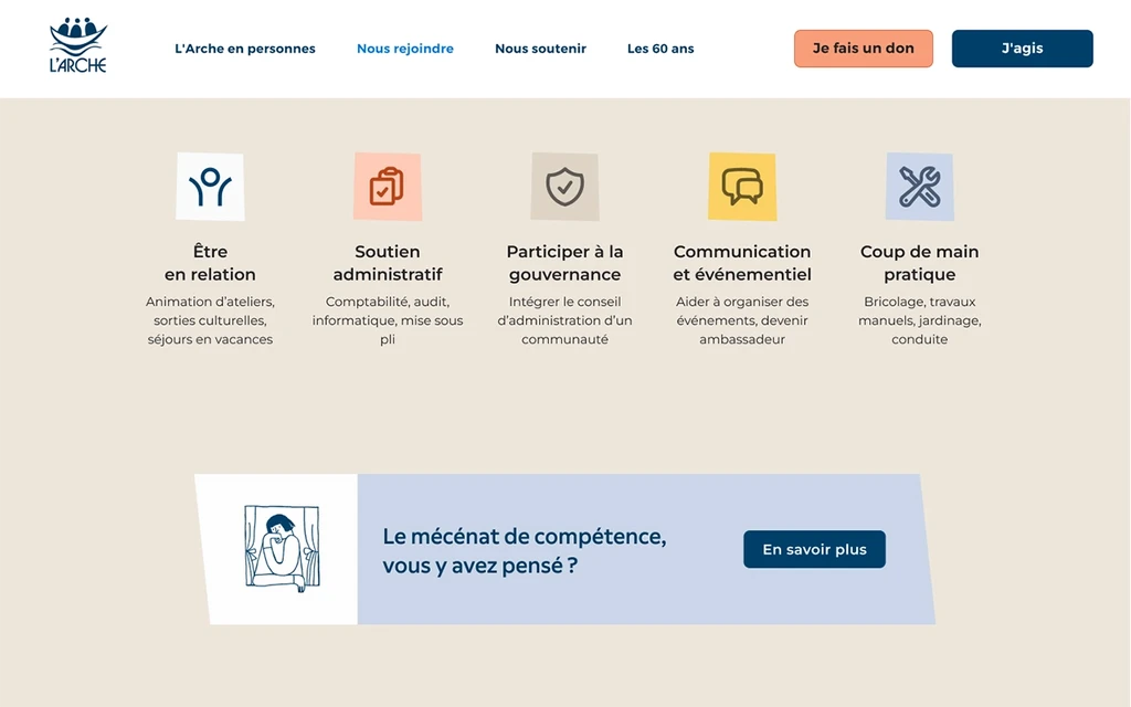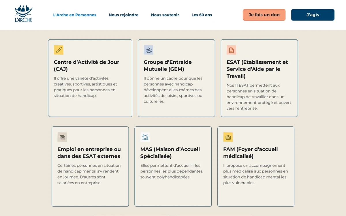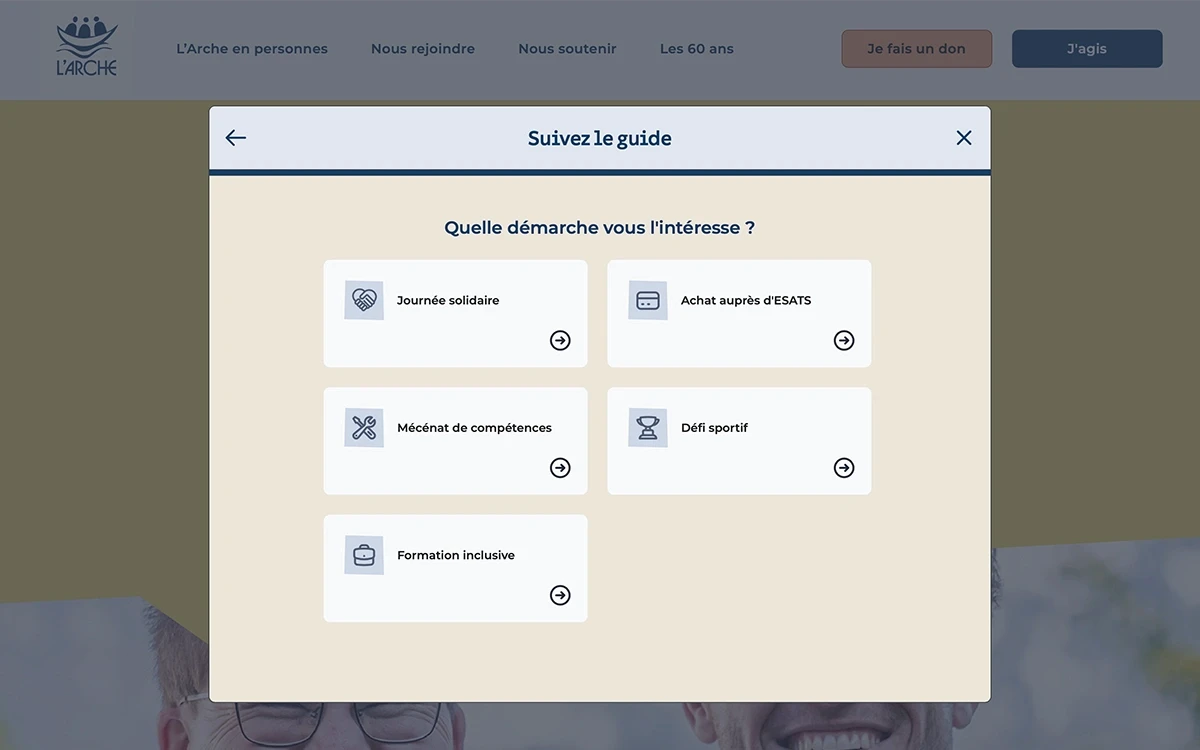 Inspirados en el espíritu de convivencia de L’Arche y en la pluralidad de la nueva identidad visual, creamos una web cuyos protagonistas son las personas. Diseñamos entonces espacios de diálogo, en donde la fotografía, el copy y los testimoniales crean pequeñas historias, así la voz de los beneficiados y proyectando el impacto positivo de quienes quieran aportar al proyecto.